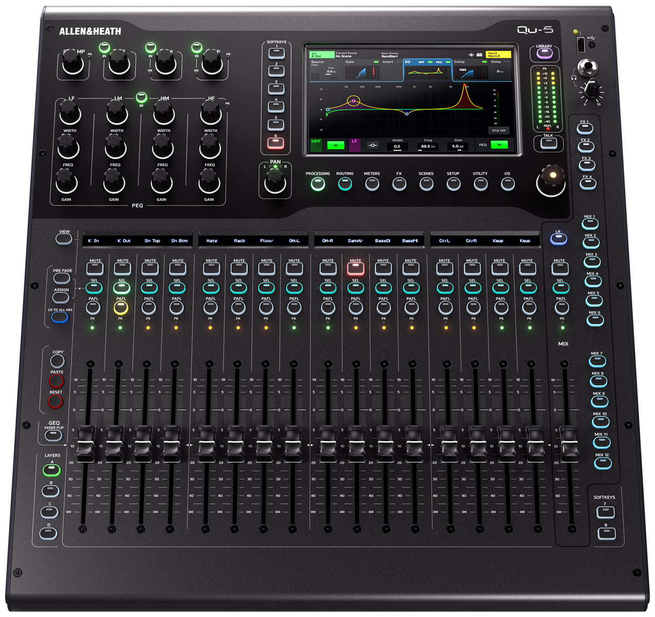 Qu5/6/7 models have an integrated 32x32 channel USB-C audio interface, 32-channel multitrack support via SD card, and stereo recording and playback via the USB-A port.