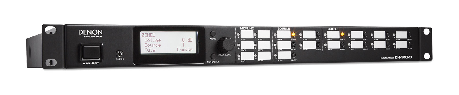 Housed in a 1U rack mount unit, the Denon DN-508MX zone mixer can provide audio for restaurant, hotel, museum, nightclub and corporate office applications. An intuitive display makes setup, operation and setting changes more accessible. Remote controllability is available by using the optional RS-232C and IP, and a web based GUI can also be employed to control all functionality.