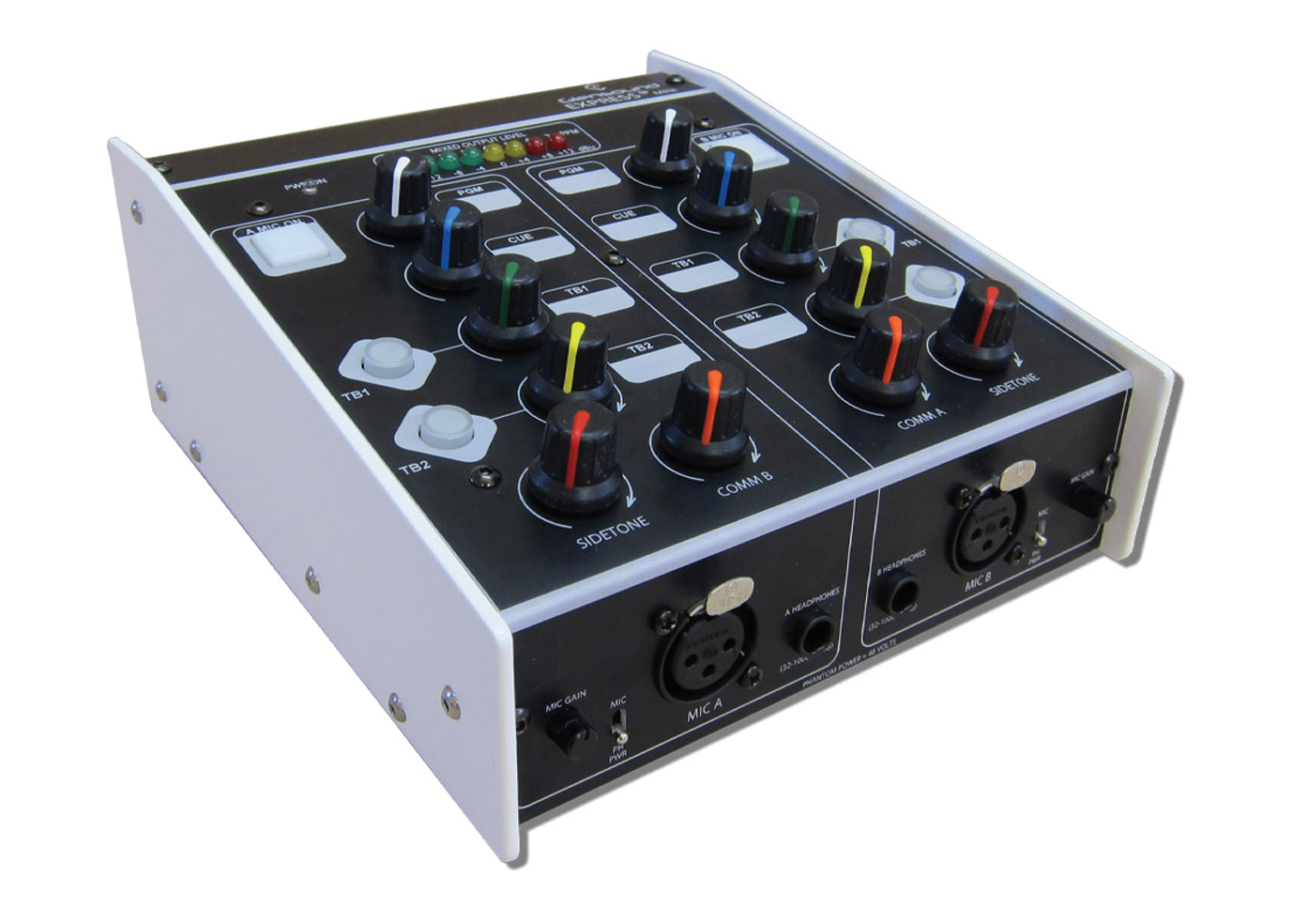 The front Panel of the Express IP MKII has two 6.35mm jack sockets that allows 35 – 1000ohms impedance headphones using A/B gauge plug. Two female 3 pin XLR sockets allow microphones to be connected to the Express IP MINI. Towards the bottom of the main panel there is a phantom power switch, this switch turns on or off the +48v phantom power input for us with condenser microphones.