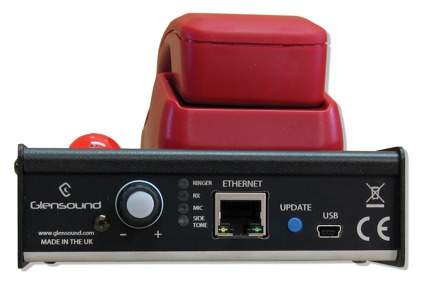 The front panel contains a volume/setup encoder, signal present LED and a LED to show a call is being received.