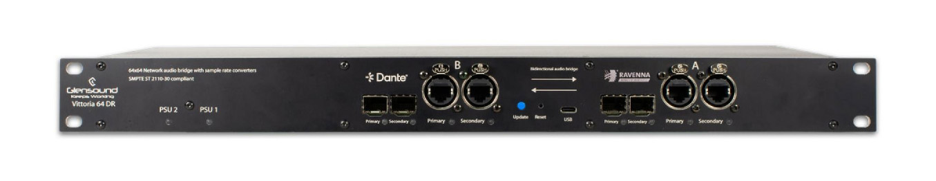Using Audinate’s Brooklyn II modules, Glensound Vittoria is designed to link thirty-two channels from either two separate Dante networks, Dante to Ravenna, or Ravenna to Ravenna. Vittoria can be used as a sample rate converter if the user connects the I/O to the same network.