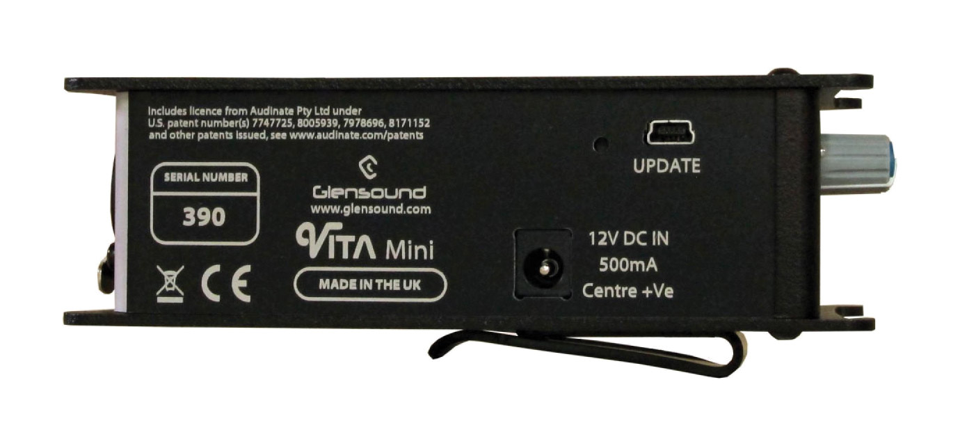 One side of the Vita Mini has a centre positive 12V DC input and a USB port for firmware updates. The back of the unit has a beltclip.