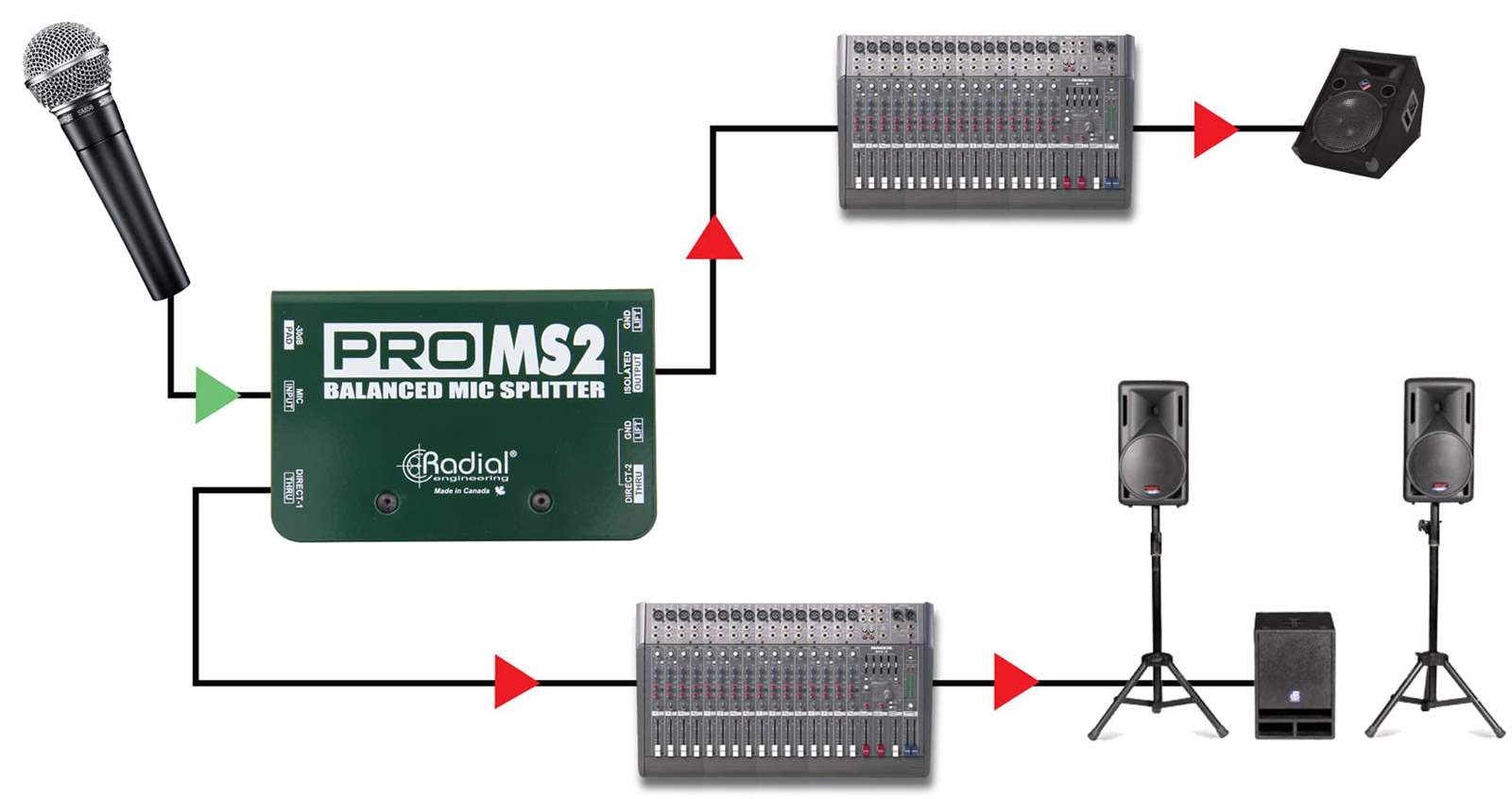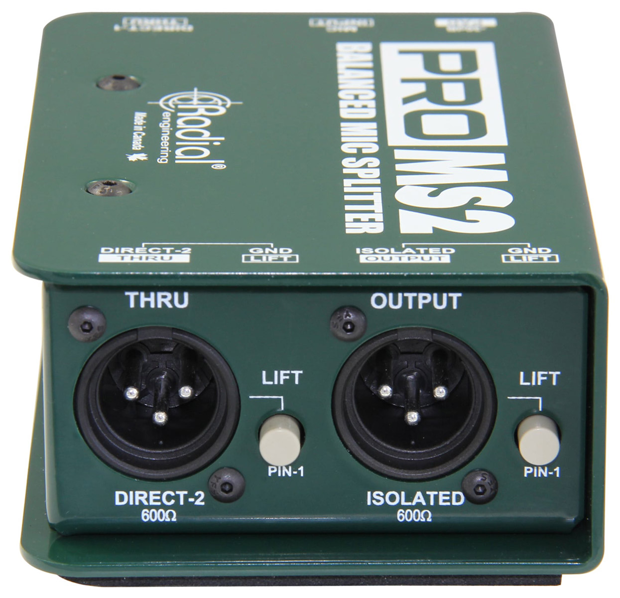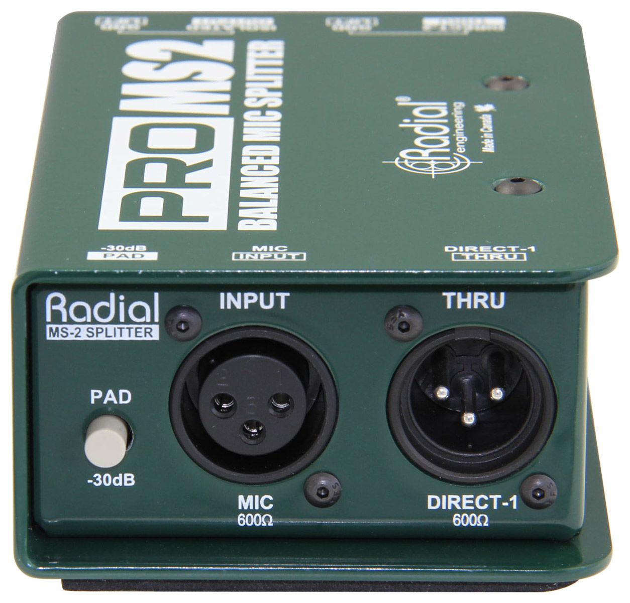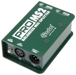 ProMS2 is a balanced mic-level splitter designed to send a signal to multiple destinations simultaneously on stage, with one transformer-isolated output and two direct outputs.