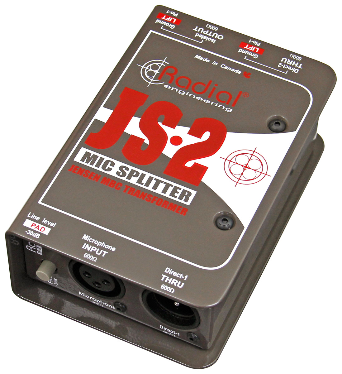 The splitter is designed to separate a single source and output to multiple destinations simultaneously without signal degradation or noise. A inbuilt Jensen JT-MB-CPC transformer with 1:1 ratio provides galvanic isolation to eliminate buzz and hum from ground loops, while maintaining a wide bandwidth of 20Hz to 20kHz, with low distortion and phase shift. Ground lifts on the outputs help further reduce noise, while an input pad allows line-level sources to connected as well. I/O connectivity is by way of 3-pin XLR connectors. JS2 can be rack mounted for touring and installation purposes, with up to eight fitting in the Radial J-Rak.