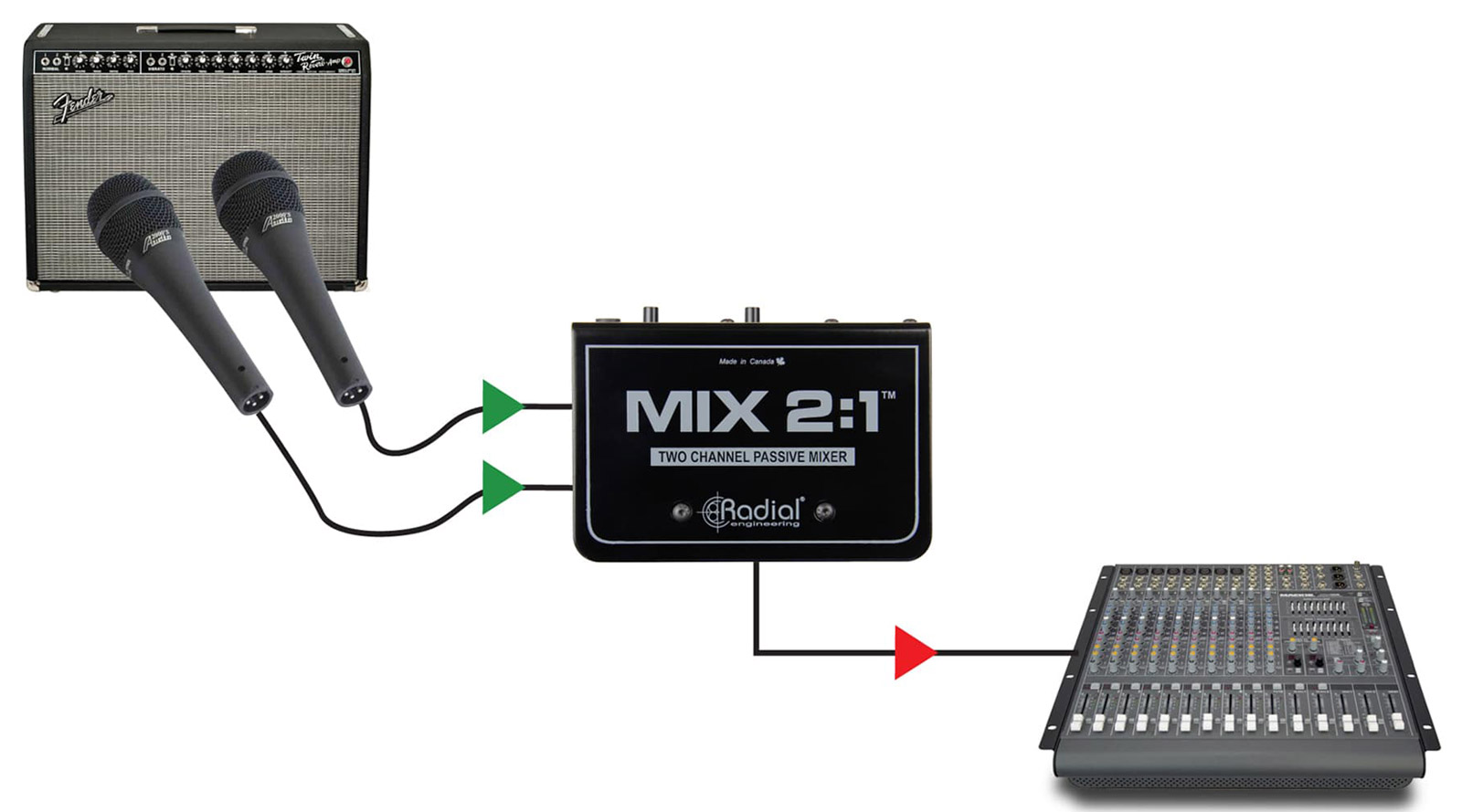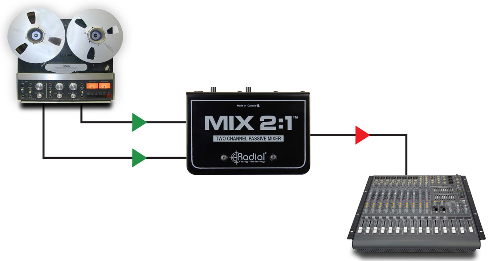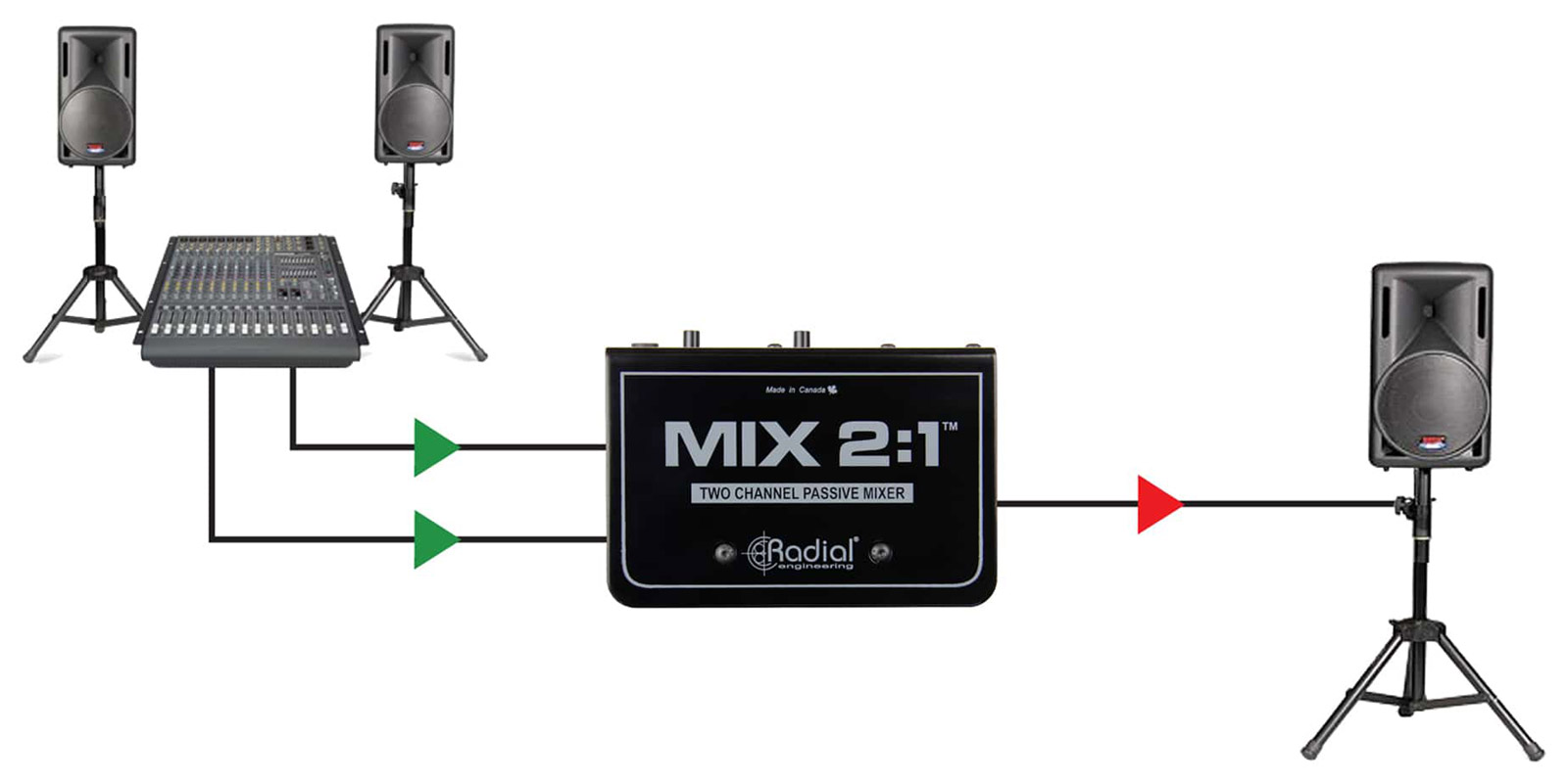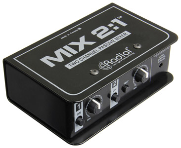 RADIAL MIX 2:1 MIXER 2-channel, passive, mono output, balanced 3-pin XLR/TRS jack input Stock code: 20-0025