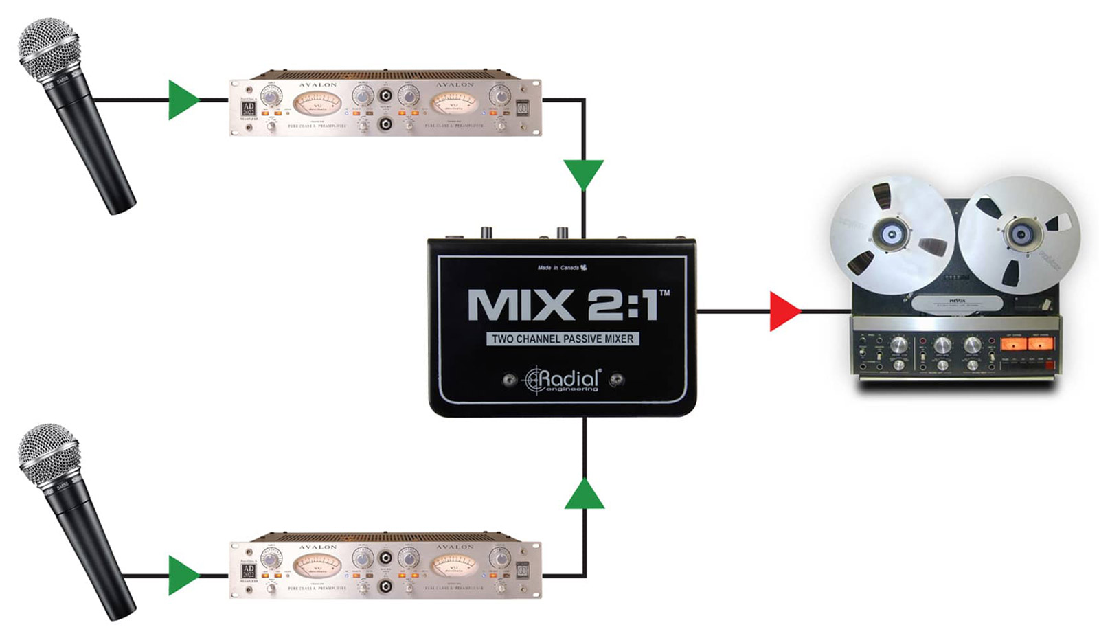 MIX 2:1 has been developed to simplify the summing of any two signals, whether it's two microphones or the stereo line outputs of a mixing console.
