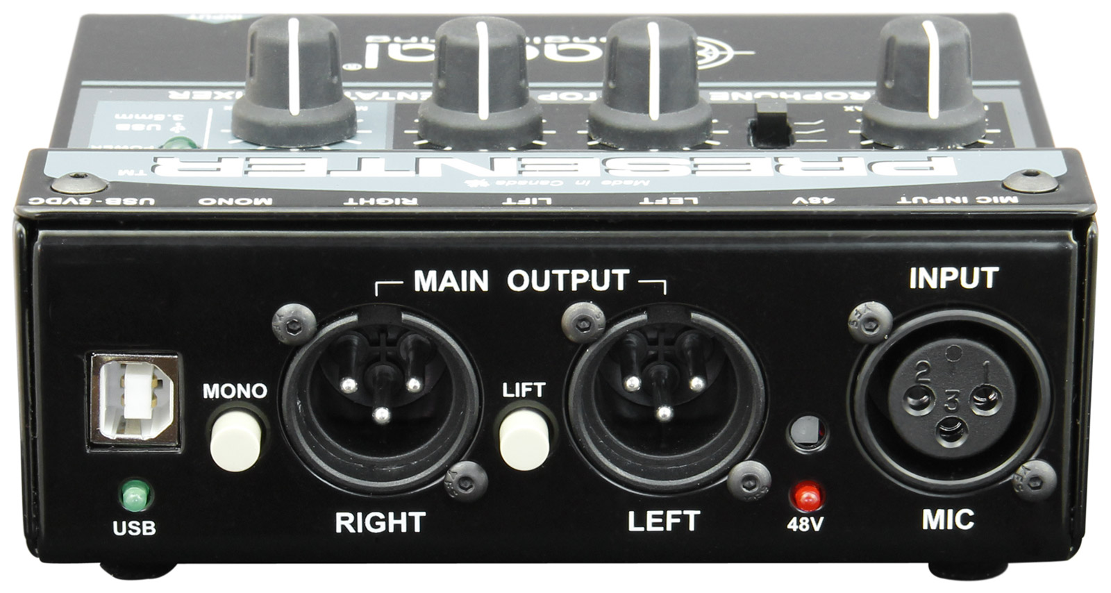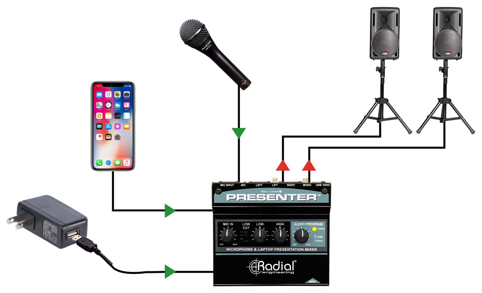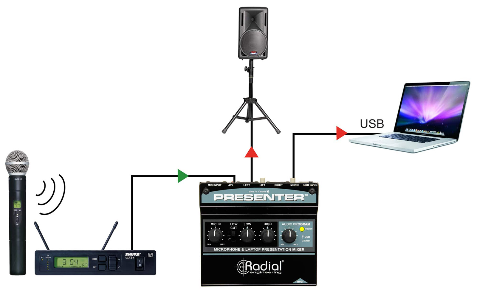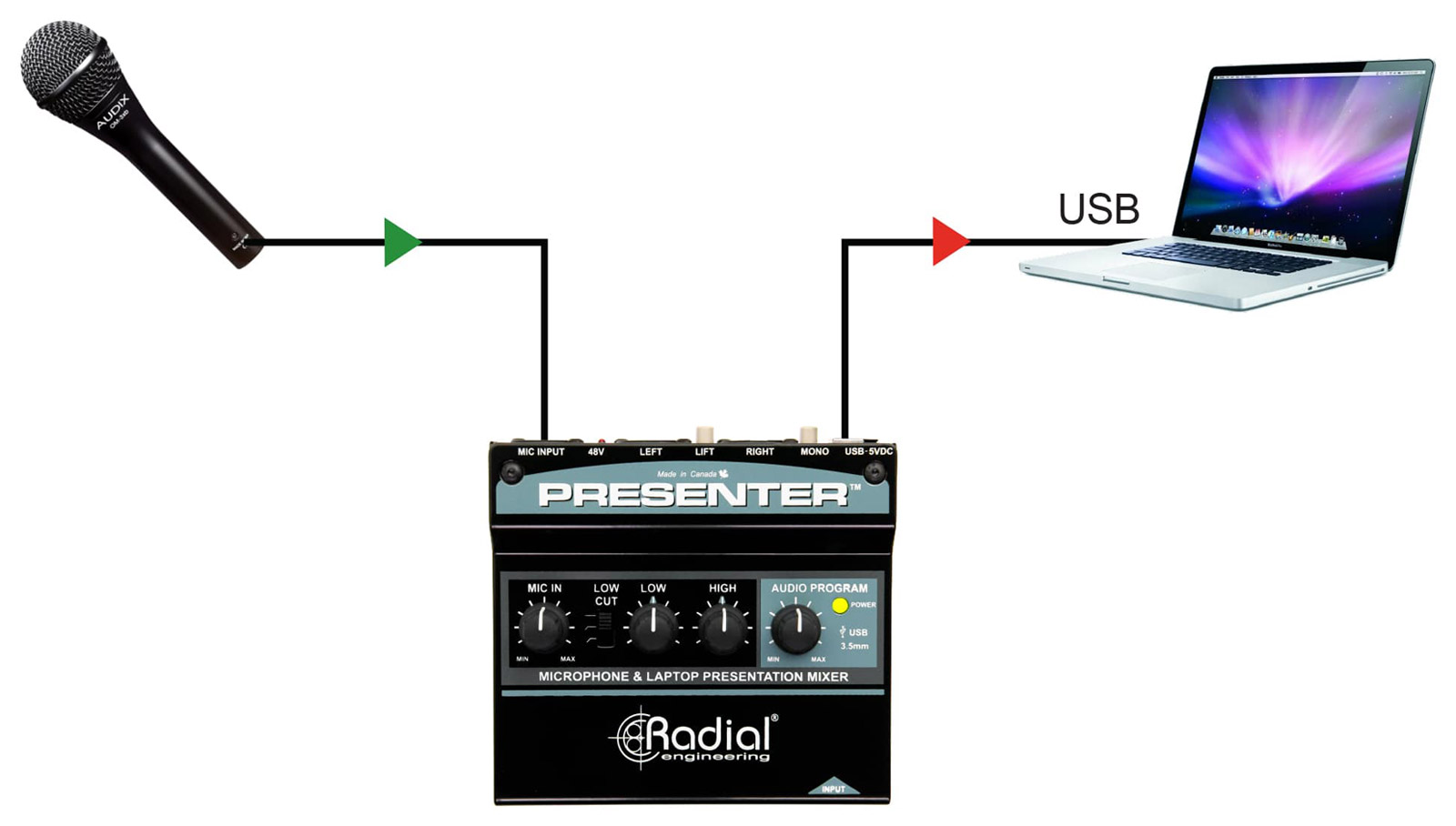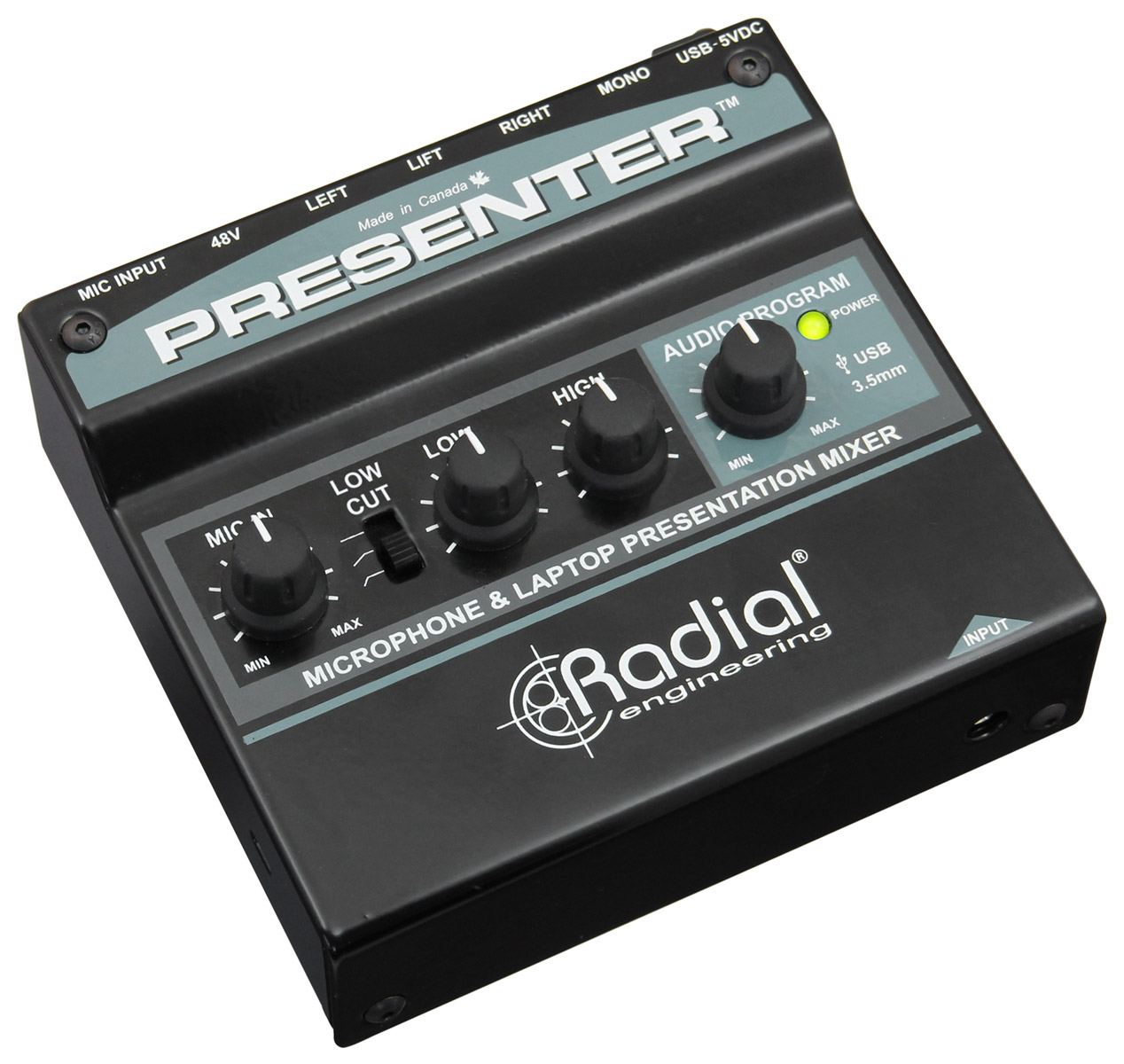 RADIAL PRESENTER MIXER 2-channel, mic/USB/3.5mm jack input, balanced 3-pin XLR outputs Stock code: 20-0026