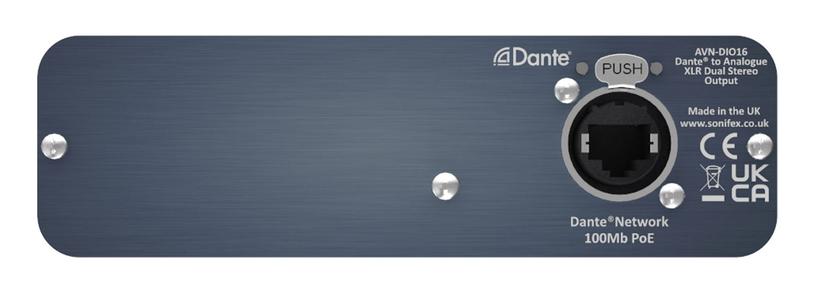 Dante I/O with stereo XLR inputs and outputs. |