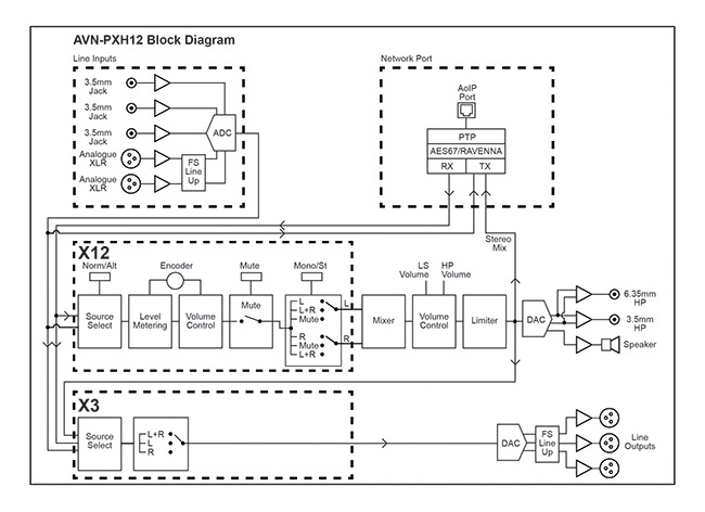 SONIFEX AVN-PXH12 MIX MONITOR AES67 AoIP, 12x 2 stereo channel in, 3x XLR analogue outputs Stock code: 95-5876